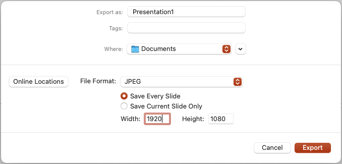 - Choose a location to save these slides to. You'll be attaching them shortly so export to a location that is easy to find.