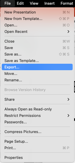 These instruction demonstrate how to export, from PowerPoint 16 running on Mac. Windows users should be similar.